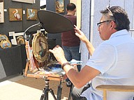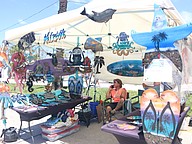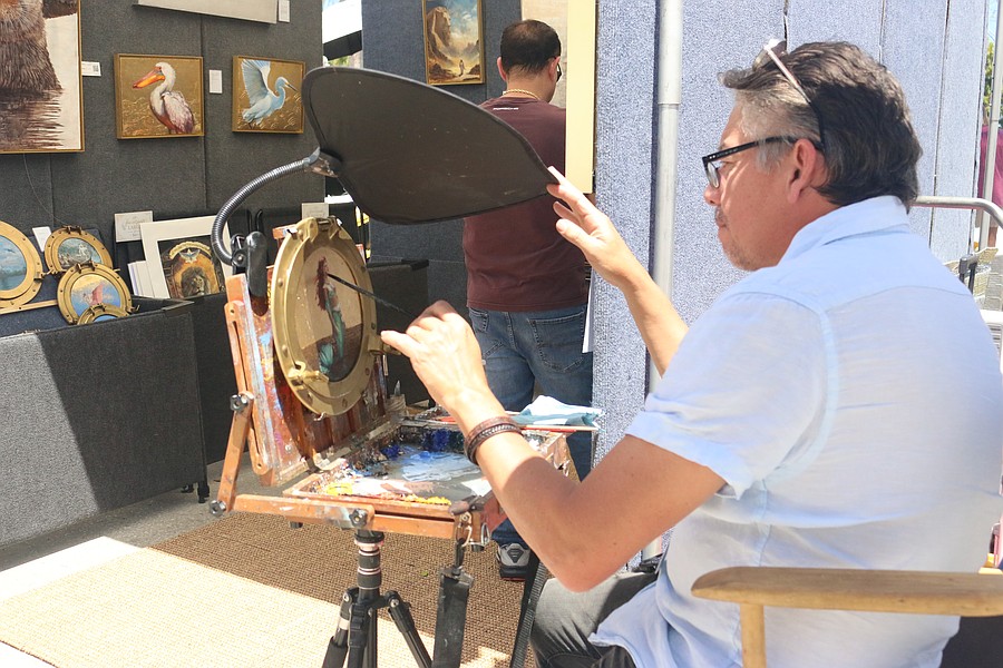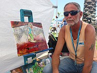 Paulo Jimenez, of DeLand, paints a mermaid while people peruse his artwork at the Daytona Beach Arts Festival. Photo by Sierra Williams