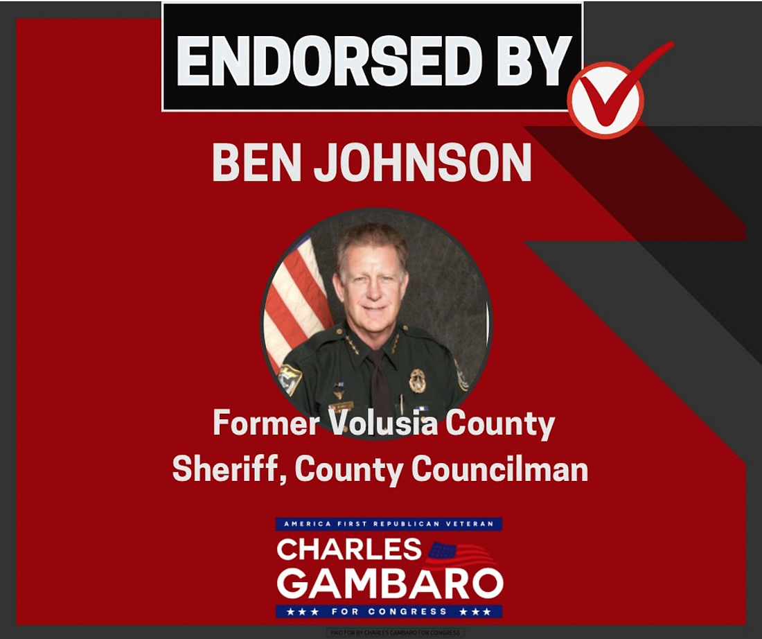 Retired Volusia County Sheriff and County Councilman Ben Johnson has announced his endorsement of Charles Gambaro, Republican candidate for Florida’s 6th Congressional District, in the upcoming Aug. 18 primary, according to a press release from the Gambaro campaign.