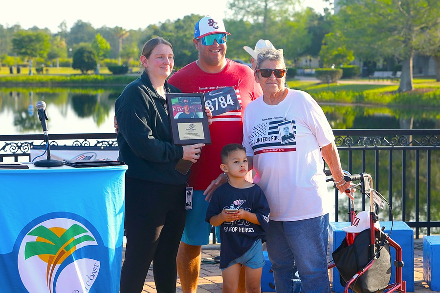 Robert “Sparky” MacDonald, who died on Dec. 28, 2025, at 74, walked the first Palm Coast Tunnel to Towers 5K in 2022 in bunker gear, much to the consternation of Palm Coast Fire Chief Kyle Berryhill. In the ceremony prior to this year's race, Berryhill presented the Follow the Footsteps Award posthumously to MacDonald with his wife, Carole, and daughter Courtney accepting.