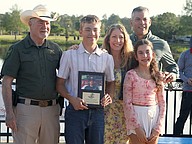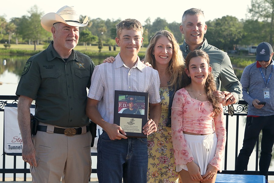 Flagler County Sheriff Rick Staly, left, presented the Youth Follow the Footsteps award to Michael Hall of Oviedo. Hall was joined by his family. Photo by Brent Woronoff