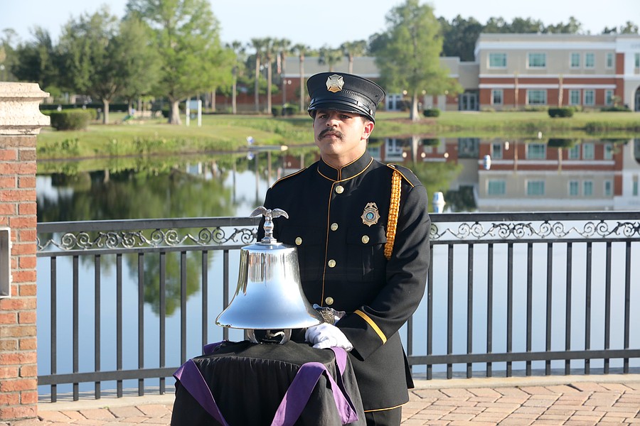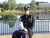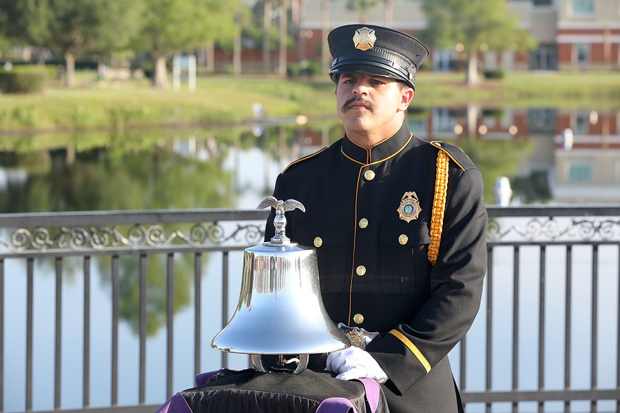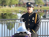 Palm Coast Fire Department Driver Engineer Ozzie Sene rings the bell to honor fallen firefighters in the pre-race ceremony. Photo by Brent Woronoff