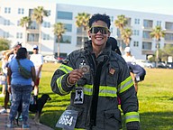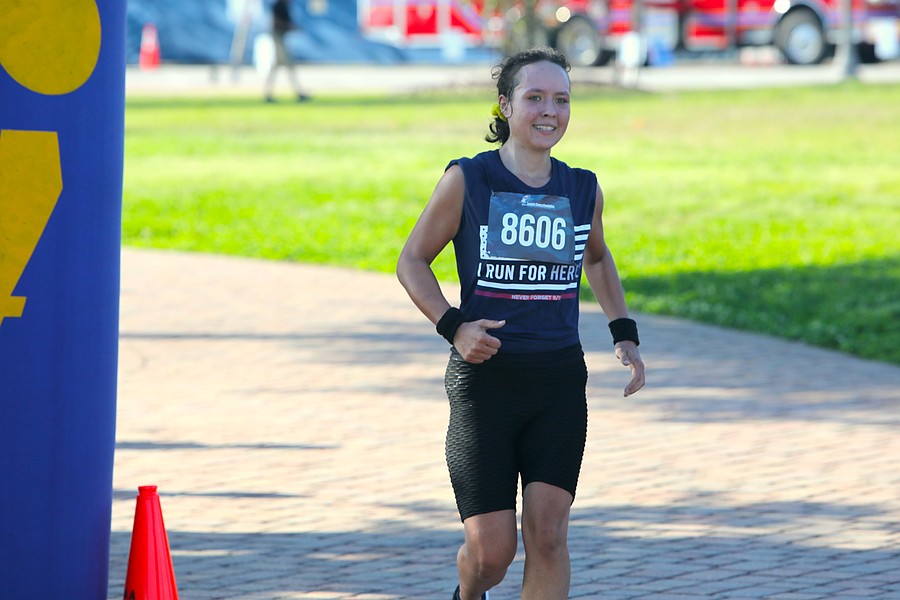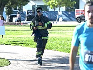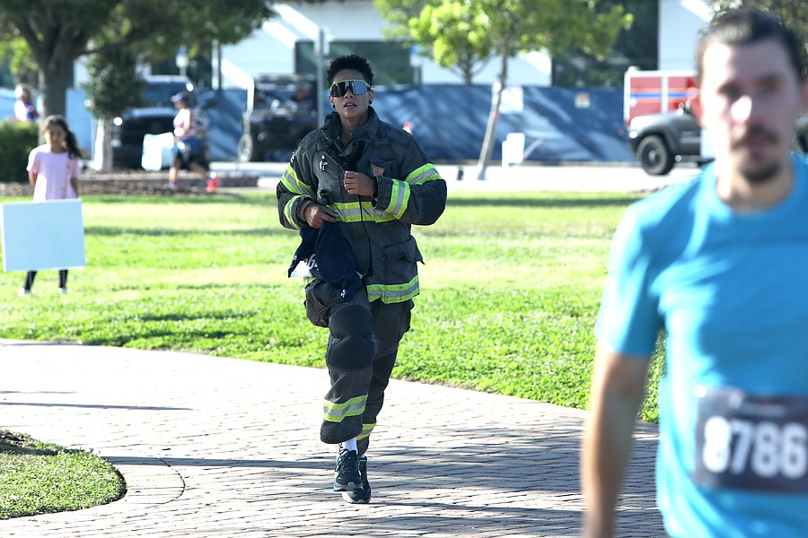 Giselle Colon of Marion County Fire Rescue was the first firefighter running in bunker gear to finish the Tunnel to Towers 5K. Her time was 28:49.15. Colon drove two hours from Ocala to participate in the 8 a.m. event. Photo by Brent Woronoff