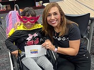 Matanzas Spanish teacher and project leader Christina Gilliam with Rymfire superhero Valentina. Courtesy photo