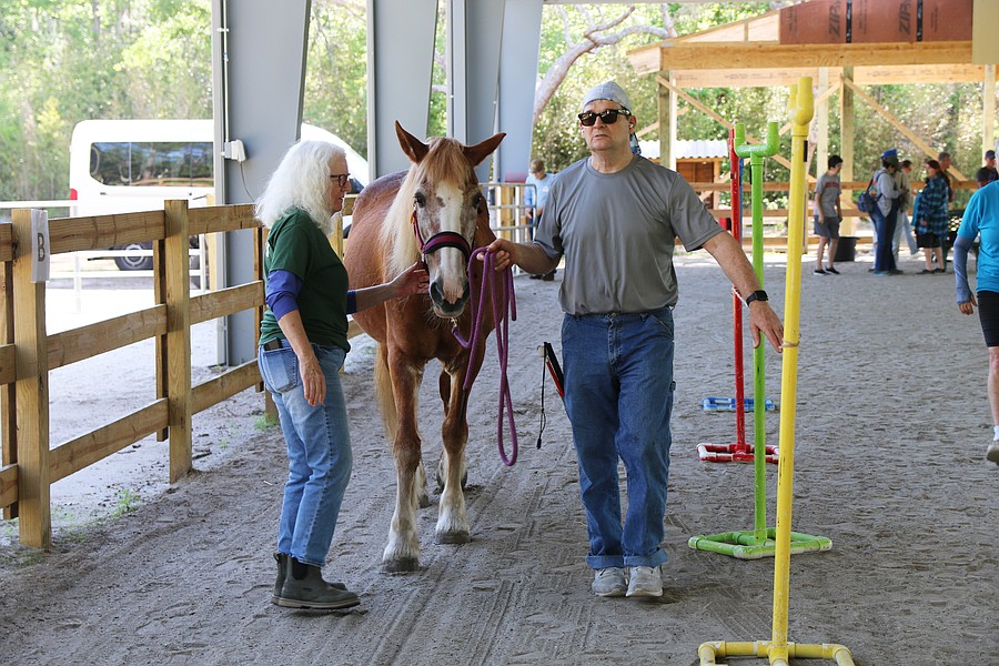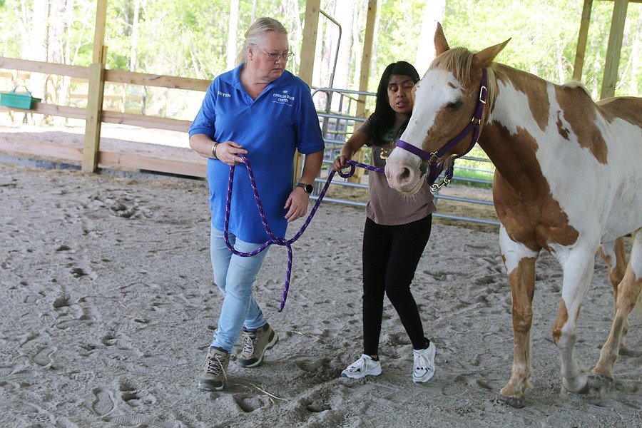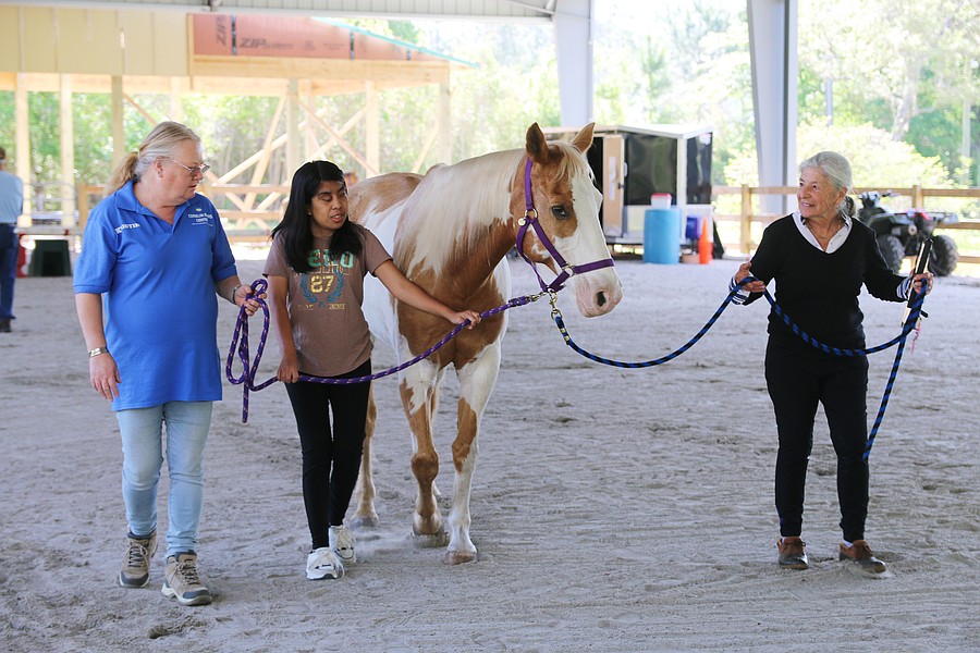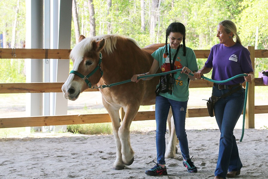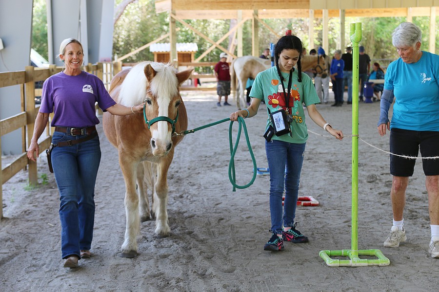 Meliza Lorenzo leads Jax alongside a Conklin Davis Center employee during the equine-assisted learning program at Whispering Meadows Ranch on Tuesday, April 14. Photo by Jarleene Almenas