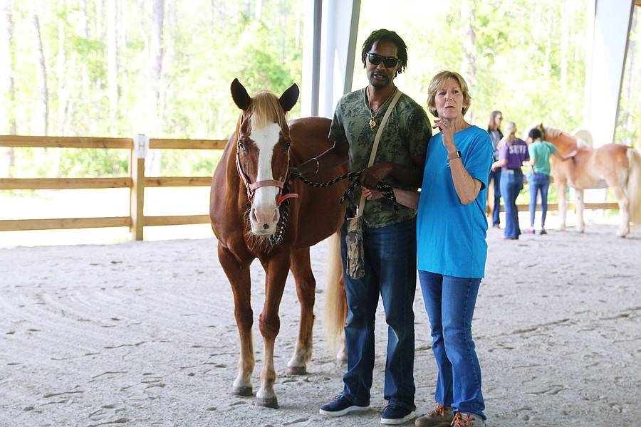 Kevin Brathwaite and a volunteer await their turn for the course during the equine-assisted learning program at Whispering Meadows Ranch on Tuesday, April 14. Photo by Jarleene Almenas
