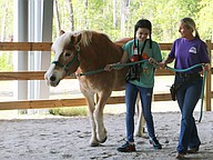 Camryn Johnson and Jenny Zimmet lead Lollipop during the equine-assisted learning program at Whispering Meadows Ranch on Tuesday, April 14. Photo by Jarleene Almenas
