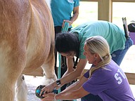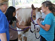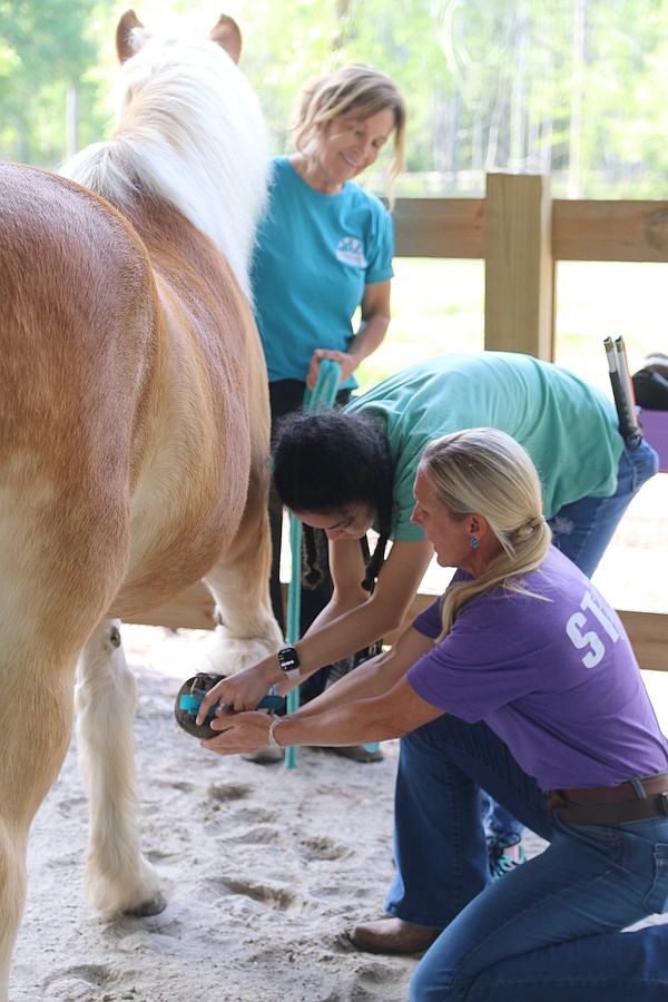 Camryn Johnson cleans Lollipop's front hoof with the help of Jenny Zimmet as Kristine Aguirre, director of Whispering Meadows Ranch (back), looks on. Photo by Jarleene Almenas