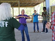 Jennny Zimmet helps leads the warmup exercises at Whispering Meadows Ranch on Tuesday, April 14. Photo by Jarleene Almenas