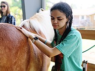 Camryn Johnson grooms Lollipop during the equine-assisted learning program at Whispering Meadows Ranch on Tuesday, April 14. Photo by Jarleene Almenas
