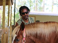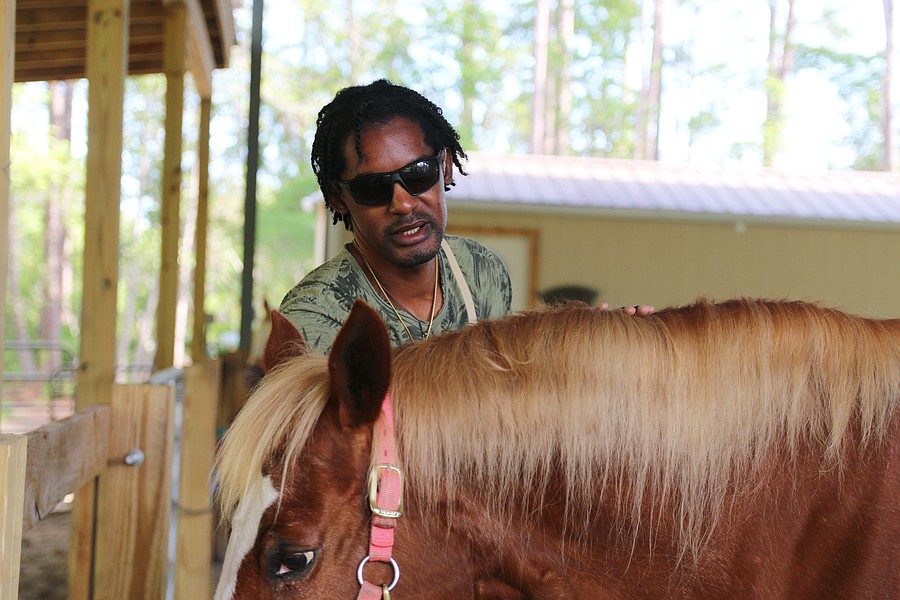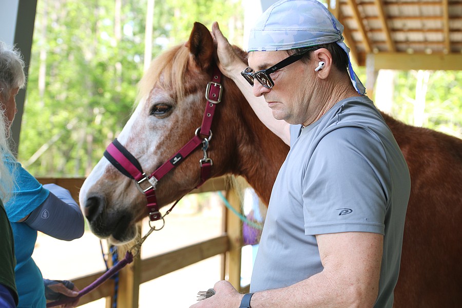 Kevin Brathwaite grooms Little Girl during the equine-assisted learning program at Whispering Meadows Ranch on Tuesday, April 14. Photo by Jarleene Almenas