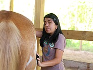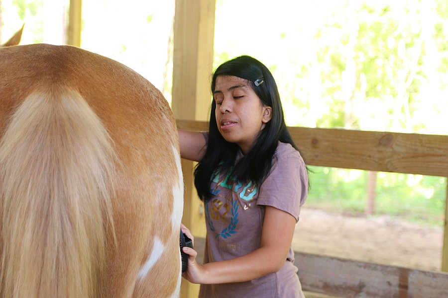 Meliza Lorenzo grooms Jax during the equine-assisted learning program at Whispering Meadows Ranch on Tuesday, April 14. Photo by Jarleene Almenas