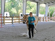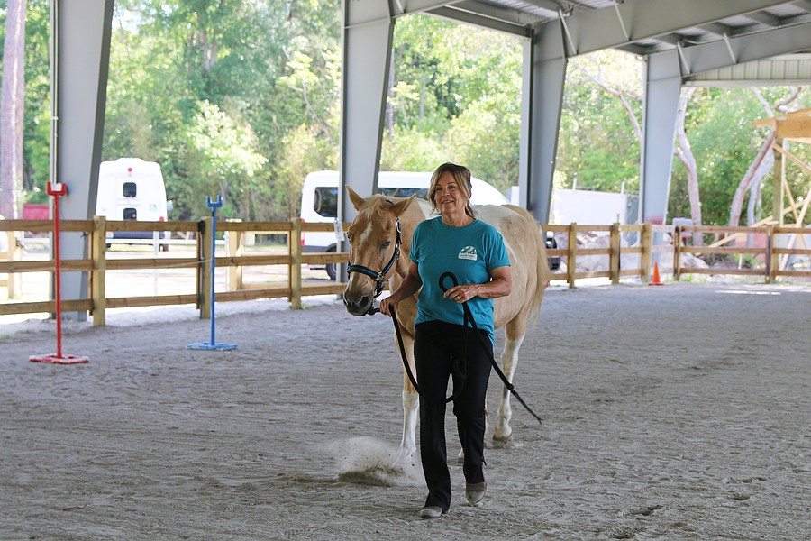 Kristine Aguirre, director of Whispering Meadows Ranch, leads Tucker at Whispering Meadows Ranch on Tuesday, April 14. Photo by Jarleene Almenas