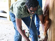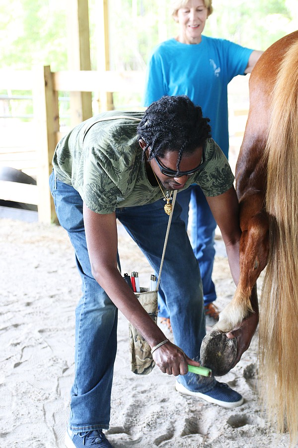 Kevin Brathwaite cleans Little Girl's back hoof during the equine-assisted learning program at Whispering Meadows Ranch on Tuesday, April 14. Photo by Jarleene Almenas