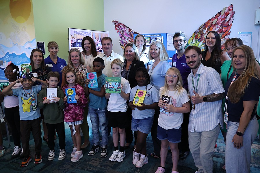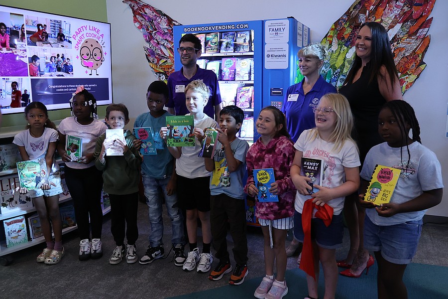 Beachside Elementary students celebrate the unveiling of the new book vending machine alongside A.J. Castro, director of Enabling & Outreach at Family Health Source; Kathy Lee, a member of the Daytona Beach Kiwanis board and Jayme Dickey, Daytona Beach Kiwanis president. Courtesy photo