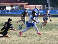 Oviedo's Julietta Decesare pulls Terri Williams flags as Williams stretches for more yardage. Photo by Brent Woronoff