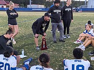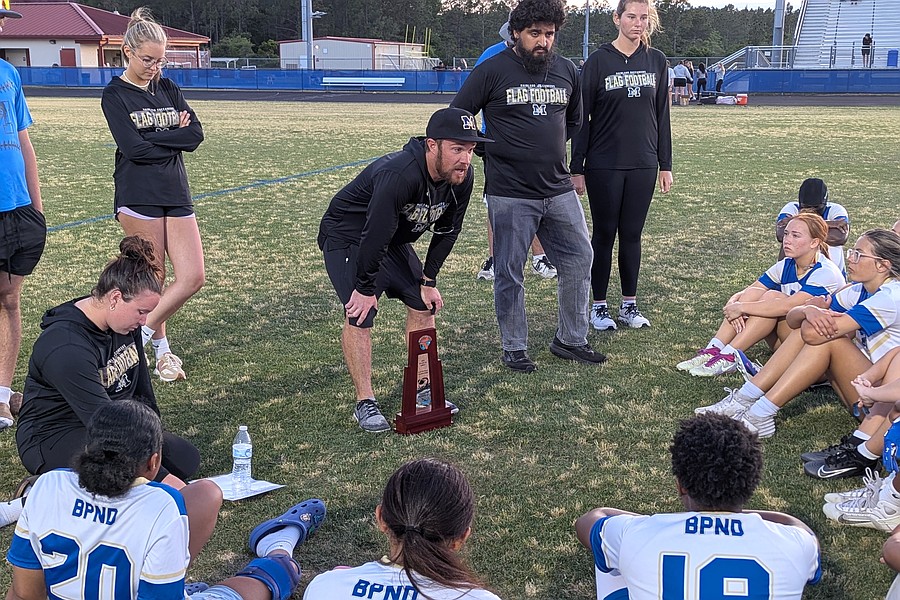 Mainland flag football coach Ethan Simpson, with the district runner-up trophy at his feet, talks to the team after its 6-0 loss to Oviedo in the District 4-3A championship game. Photo by Brent Woronoff