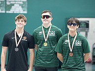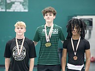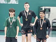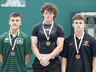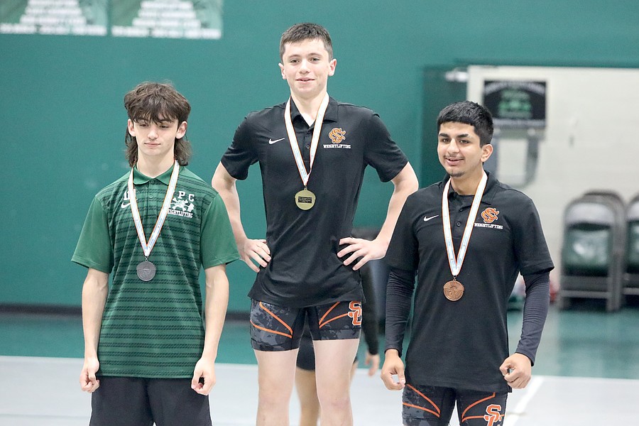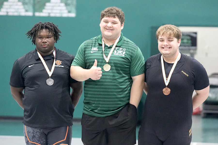 FPC's Landon Gates (center) won the 183-pound title in the Olympic competition. Spruce Creek's John Wheeler was second and FPC's Marlon Alvarado (right) was third. Photo by Brent Woronoff