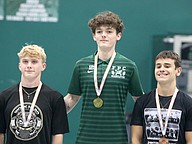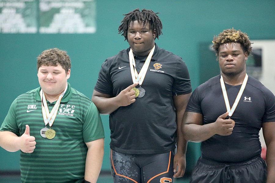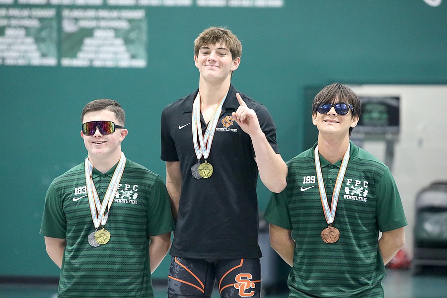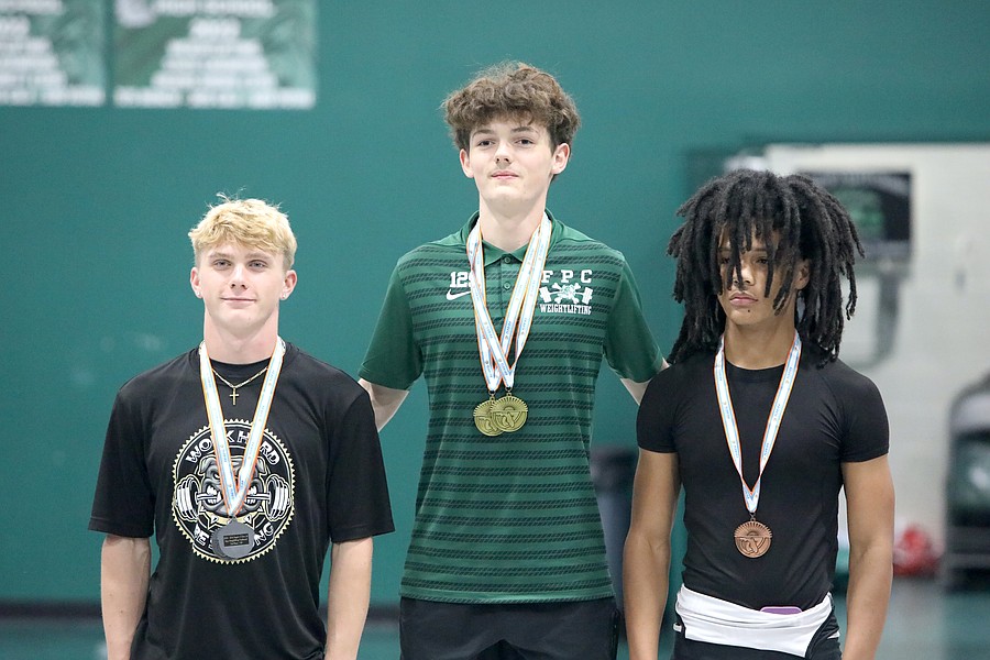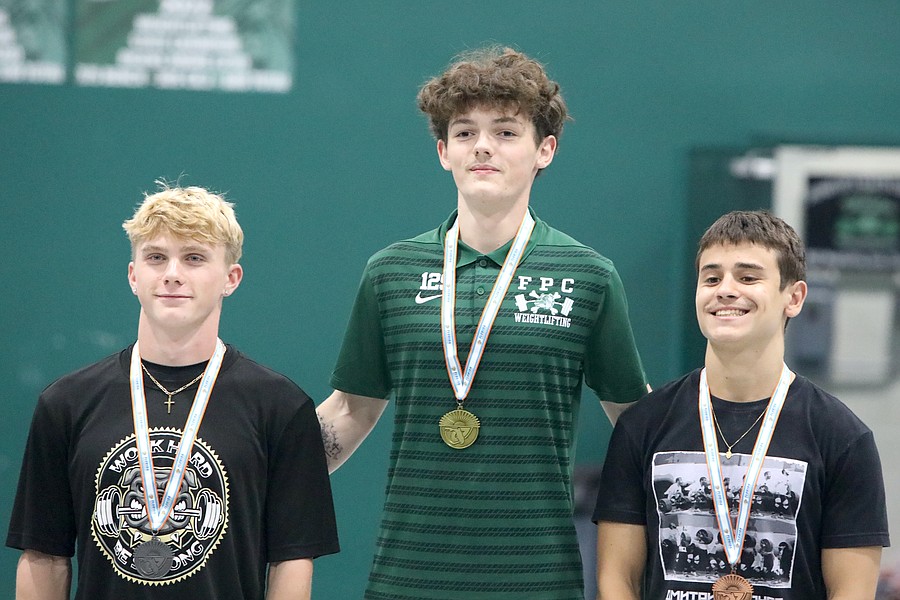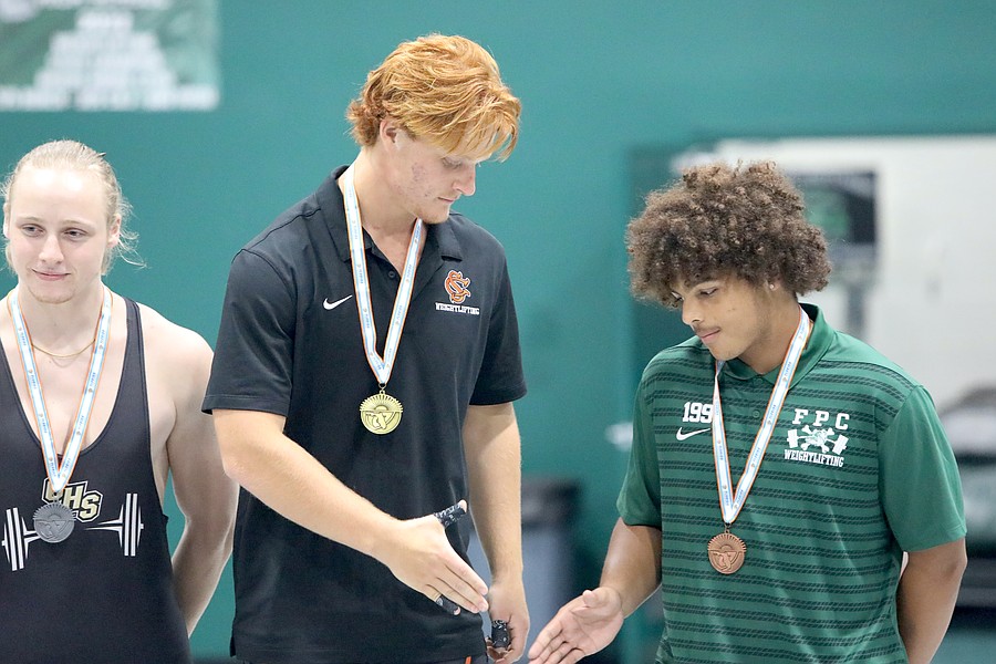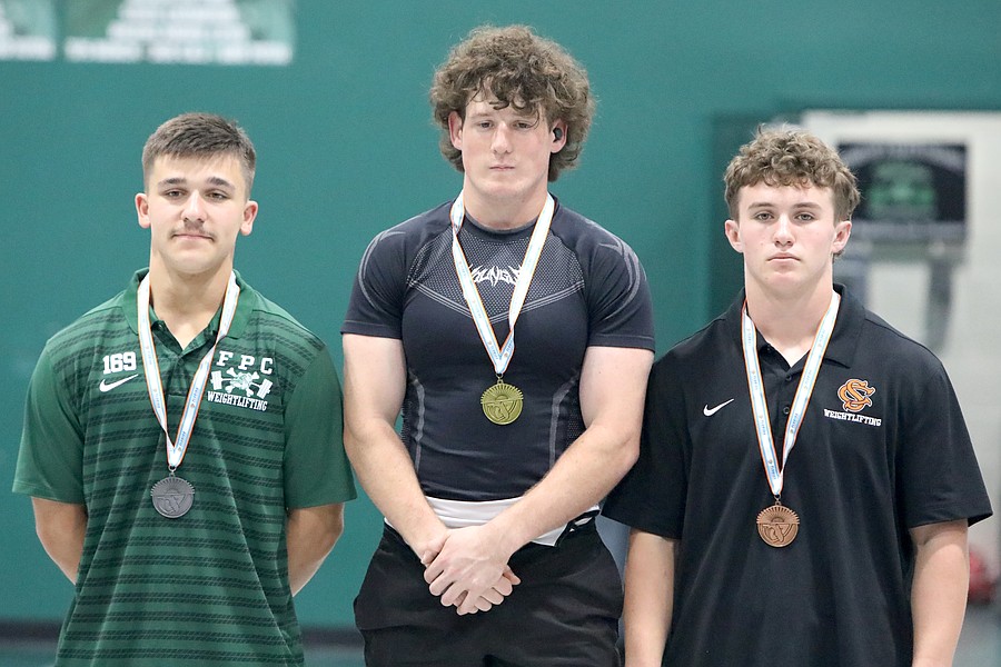 Jackson Fedun (left) placed second in Olympic in the 169-pound weight class. Oakleaf's Noah Shevchook (center) won with a 570-pound total. Photo by Brent Woronoff