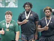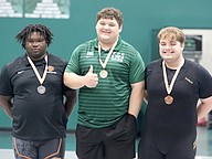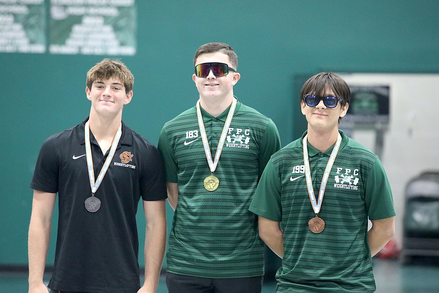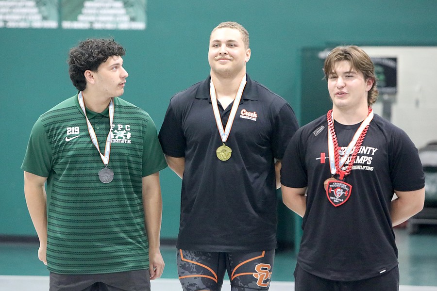 FPC's Tyler Davidson (left) placed second in the Olympic competition at 219 pounds. Spruce Creek's Christian Jones (center) won both titles. Photo by Brent Woronoff
