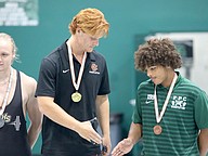 Spruce Creek's Brian Begnoche, winner of the 199-pound weight class in both competitions, shakes FPC's Mathias Parker's hand on the podium. Parker placed third in both competitions. Photo by Brent Woronoff