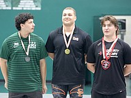Landon Gates (left) and Marlon Alvarado (right) finished second and third, respectively, in traditional competition at 183 poounds. Spruce Creek's John Wheeler won the region title. Photo by Brent Woronoff