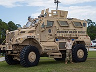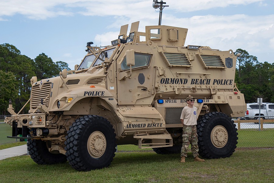 Cadet Airman Benjamin Berglund stands beside Ormond Beach Police's MRAP at Founder's Day. Photo by Suzanne McCarthy