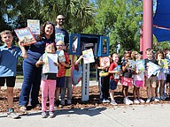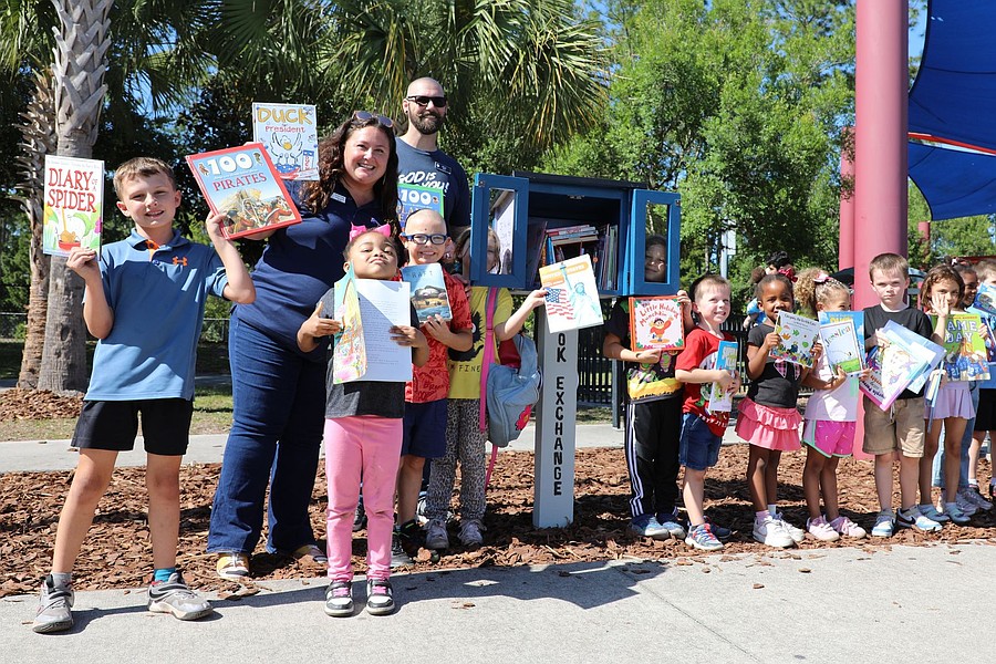 Flagler Schools Language Arts Specialist Kristin Frank and Rymfire Elementary School students helped unveil the city of Palm Coast's newest Little Free Library at Ralph Carter Park on April 23.