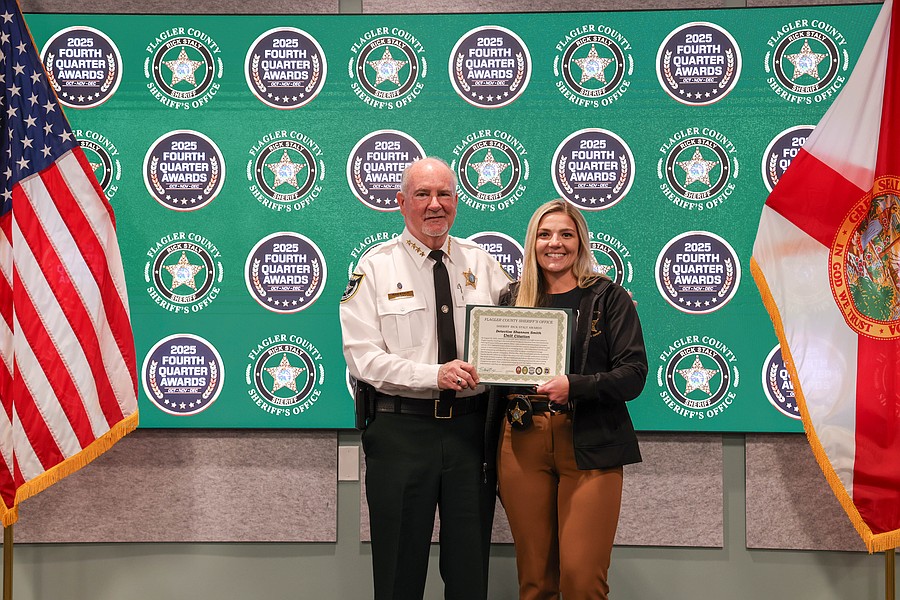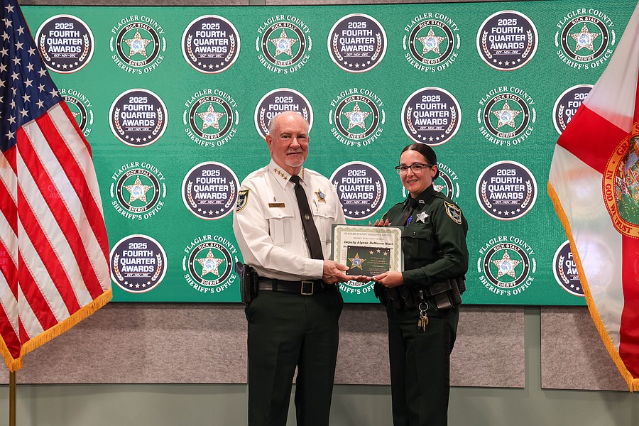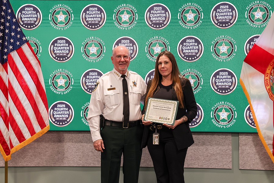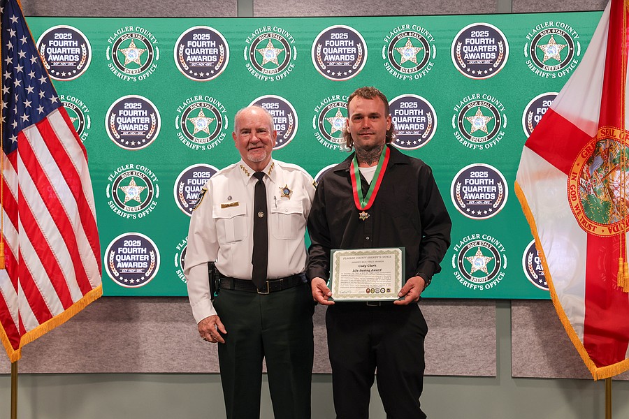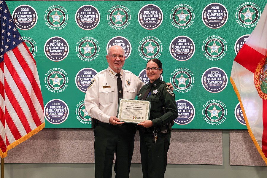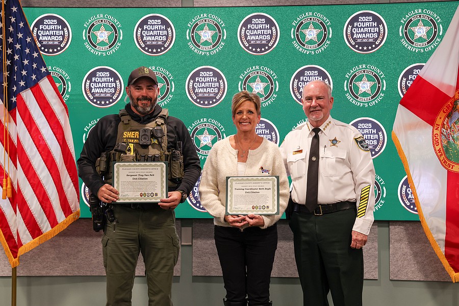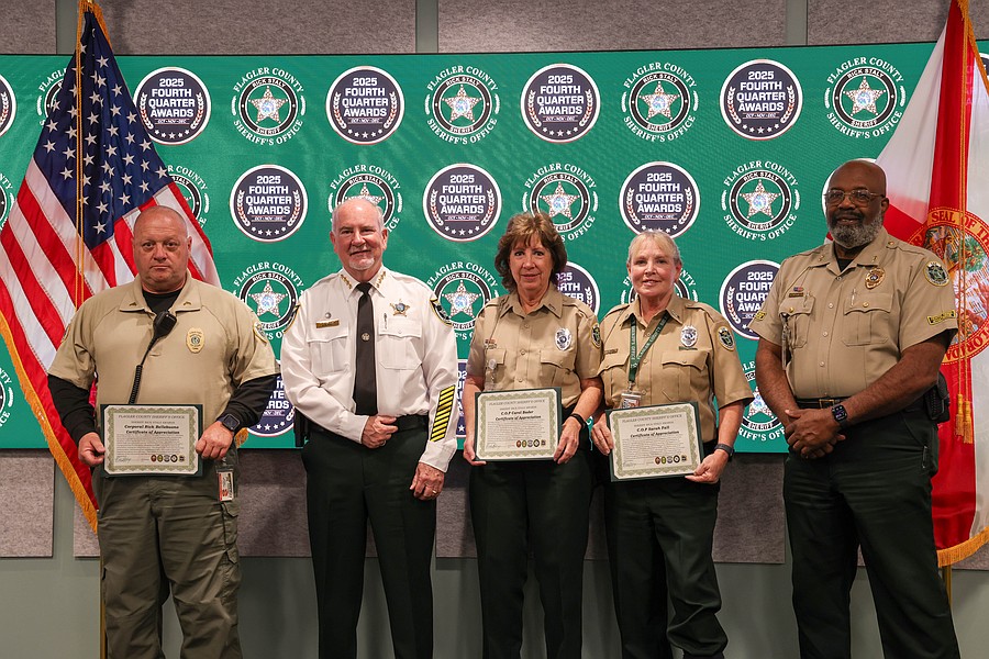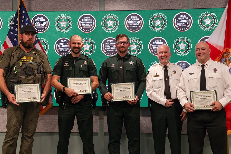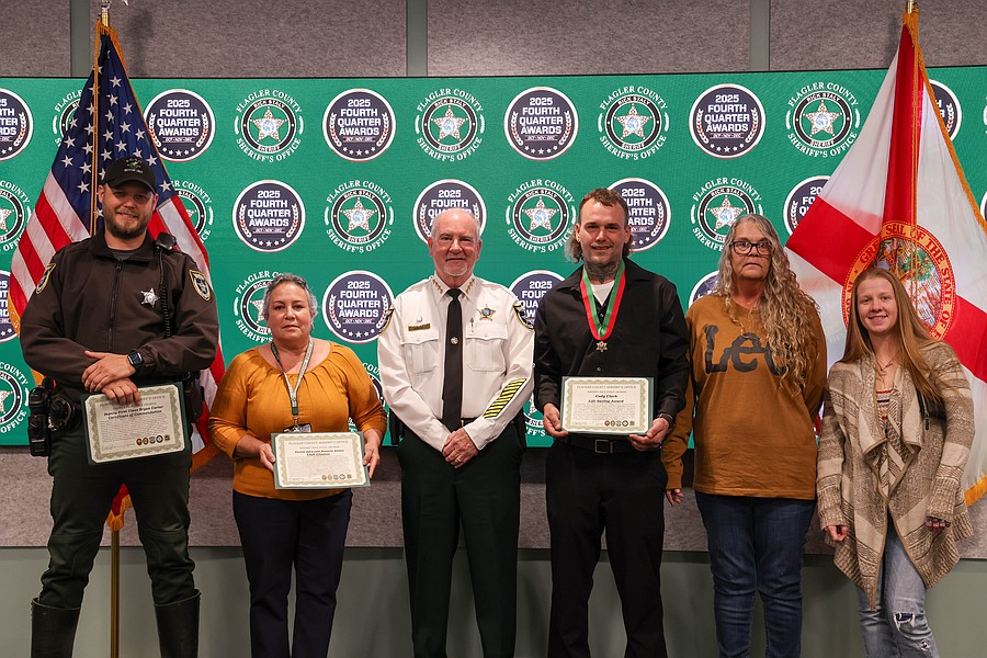 A 911 caller whose actions saved a kidnapping victim from a registered sex offender’s grasp and employees whose actions helped save a man from jumping off an overpass, resulted in the arrest of three suspects charged with a total of 36 felonies, and helped locate and save the life of an unconscious but breathing Silver Alert subject are among those who were honored during the Flagler County Sheriff’s Office’s 2025 Fourth Quarter Awards Ceremony held on Jan. 29 at the Flagler County Sheriff’s Office Operations Center.