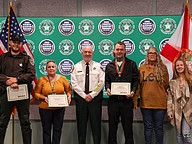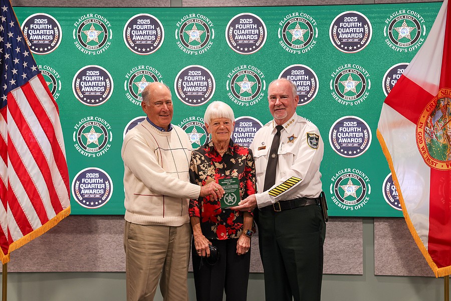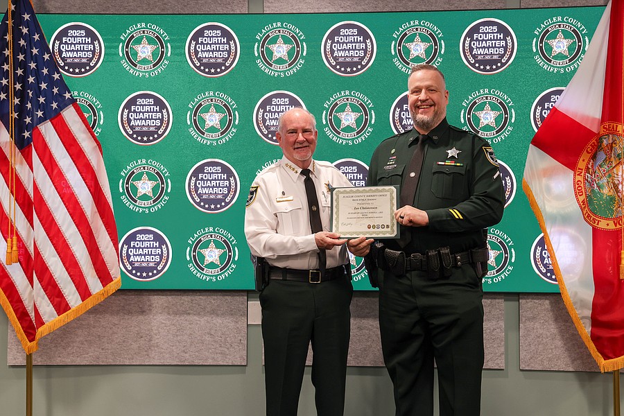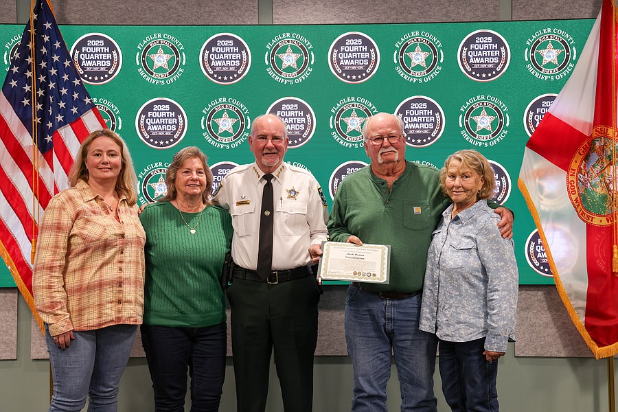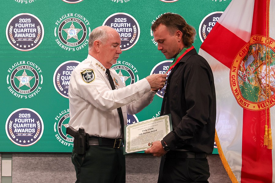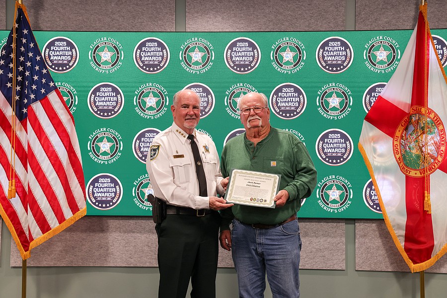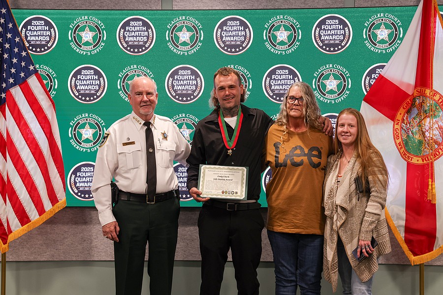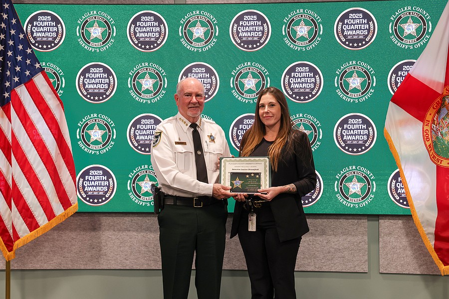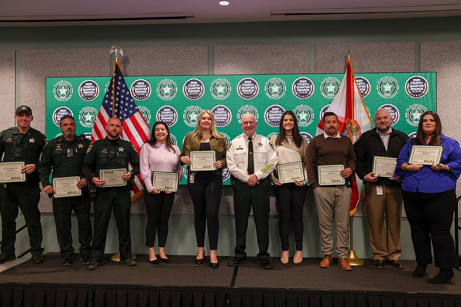 A 911 caller whose actions saved a kidnapping victim from a registered sex offender’s grasp and employees whose actions helped save a man from jumping off an overpass, resulted in the arrest of three suspects charged with a total of 36 felonies, and helped locate and save the life of an unconscious but breathing Silver Alert subject are among those who were honored during the Flagler County Sheriff’s Office’s 2025 Fourth Quarter Awards Ceremony held on Jan. 29 at the Flagler County Sheriff’s Office Operations Center.