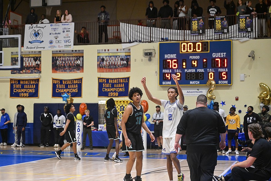Canyon Powers (2) celebrates Mainland's 76-71 win against Atlantic in the Five Star Conference championship game on Friday, Jan. 30 at the Vince Carter Athletic Center. Photo by Michele Meyers