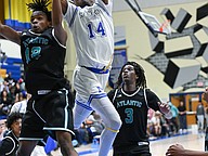 Mainland's Davon Jones (right) attempts a basket against Atlantic during the Five Star Conference championship game on Friday, Jan. 30 at the Vince Carter Athletic Center. Photo by Michele Meyers
