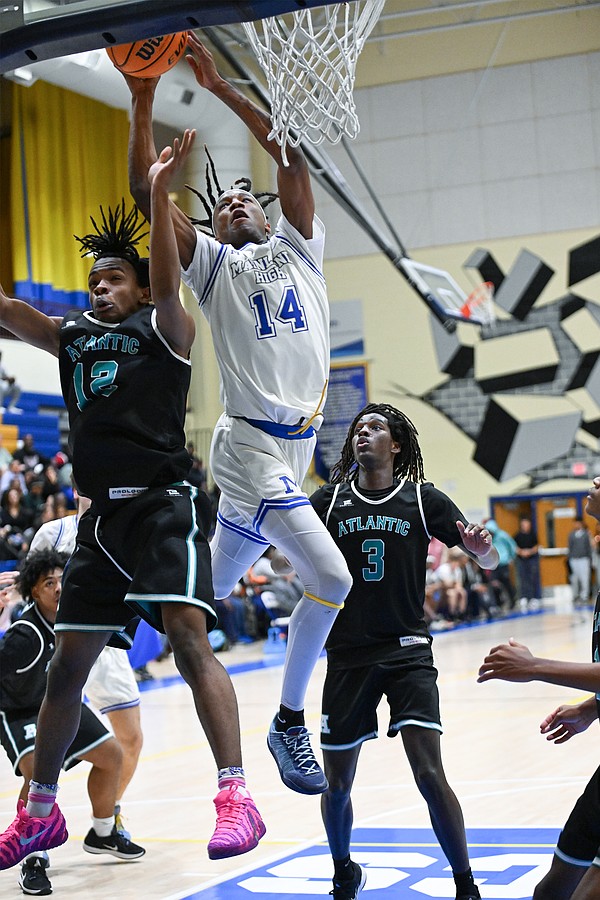 Mainland senior Jaheem Curry (14) squeezes in between Atlantic players to make a basket during the Five Star Conference championship game on Friday, Jan. 30 at the Vince Carter Athletic Center. Photo by Michele Meyers