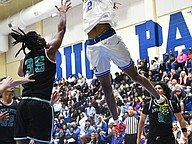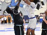 Mainland's Jaheem Curry (left) launches himself at the rebound during the Five Star Conference championship game against Atlantic on Friday, Jan. 30 at the Vince Carter Athletic Center. Photo by Michele Meyers