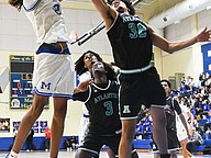 Atlantic's Mekhi Yan (32) gets the rebound during the Five Star Conference championship game against Mainland on Friday, Jan. 30 at the Vince Carter Athletic Center. Photo by Michele Meyers