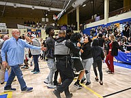 Mainland School Resource Officer Daniel Peralta (center) was instrumental in diffusing a fight between two players after the Five Star Conference championship game between Mainland and Atlantic at the Vince Carter Athletic Center on Friday, Jan. 30. Photo by Michele Meyers