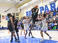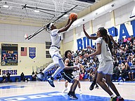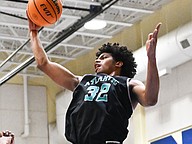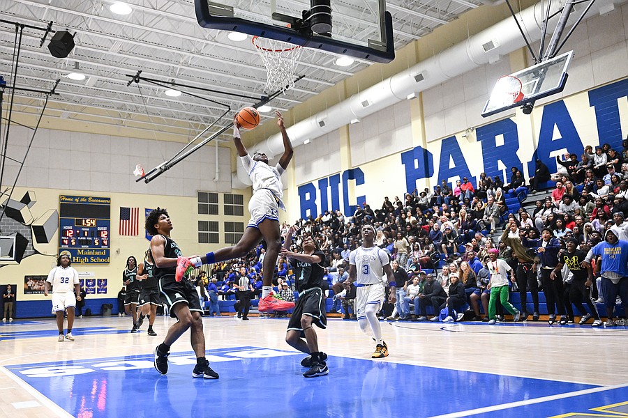 Mainland's Jaden "Melo" Parks goes up for a layup as the crowd goes wild at the Five Star Conference championship game against Atlantic on Friday, Jan. 30 at the Vince Carter Athletic Center. Photo by Michele Meyers