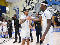 Mainland's Beegie Gordon (1) runs through his handshake routine with Jaden "Melo" Parks (right) at the Five Star Conference championship game against Atlantic on Friday, Jan. 30 at the Vince Carter Athletic Center. Photo by Michele Meyers