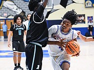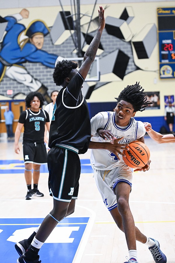 Mainland's Davon Jones (right) drives past Atlantic during the Five Star Conference championship game on Friday, Jan. 30 at the Vince Carter Athletic Center. Photo by Michele Meyers