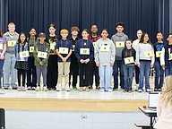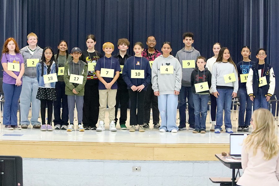 Flagler Schools Spelling Bee participants (from left): Lily Dotson, Pax Zwirn, Layla Verdote, Adalina Petkovsek, Koby Sanchez, Rose Eberhardinger, Torin Crist, Skye Soler, Anabelle Roscoe, Kali McClease, Nyasia Saleem, Cooper Room Brayden Dills, Sophia Roberto, Rilee Room, Eaint Maung and Sean Adrian Salvacion. Photo by Brent Woronoff