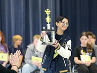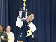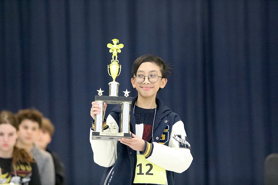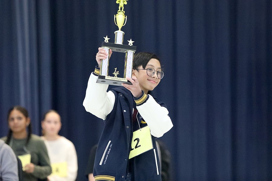 Sean Adrian Salvacion holds up his trophy after winning the 2026 Flagler Schools Spelling Bee. Photo by Brent Woronoff