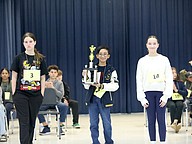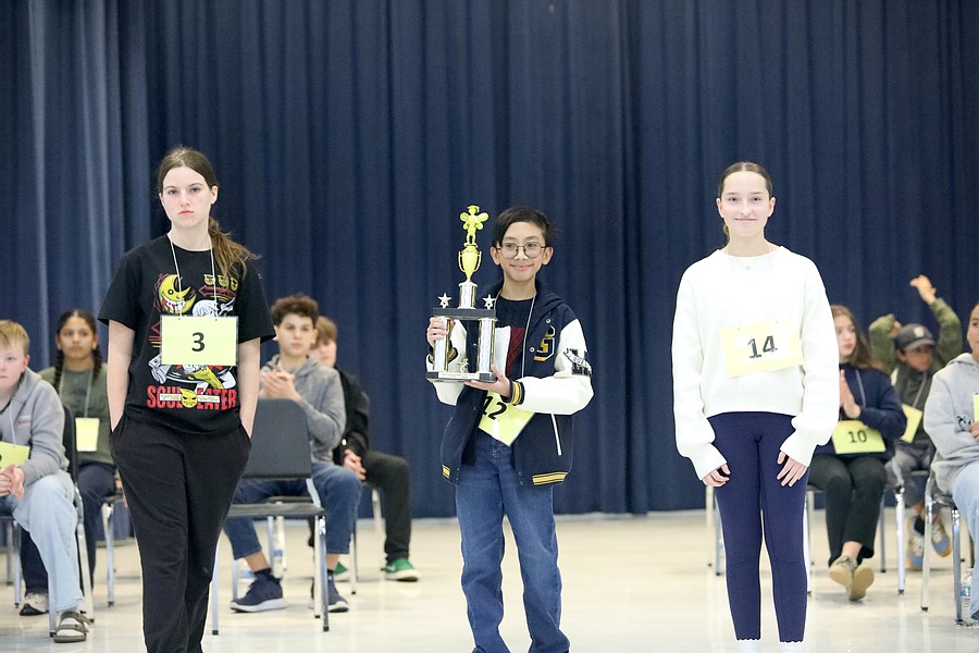 Spelling Bee champ Sean Adrian Salvacion with runner-up Rose Eberhardinger (left) and third-place speller Sophia Roberto. Photo by Brent Woronoff
