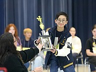 Sean Adrian Salvacion of Imagine School At Town Center holds up his Spelling Bee trophy. Photo by Brent Woronoff