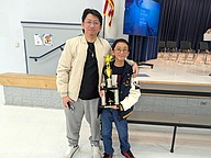 Spelling Bee winner Sean Adrian Salvacion with his dad, Adrian Salvacion. Photo by Brent Woronoff