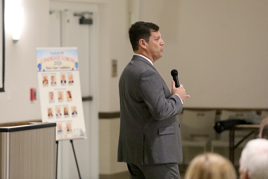 Tony Amaral is running for the District 2 seat. He has lived here since he was 9 years old. He said he became a builder in 1991, receiving mock boos from the audience to that “big confession.” He quickly added that he’s not a developer. He said he builds on lots that were originally set aside. With most ad valorem taxes “coming out of homes,” the city needs to increase clean industry, he said. Amaral said infrastructure is deteriorating because there was never really a plan to set repairs in motion. He said the city should set aside a percentage of its annual budget toward infrastructure.