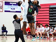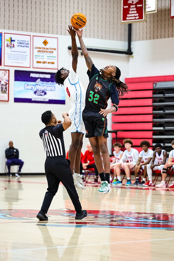 Seabreeze's Jeremiah Outler (0) and Jones' Christopher Oliver take the opening tip. Photo by Keishia McLendon