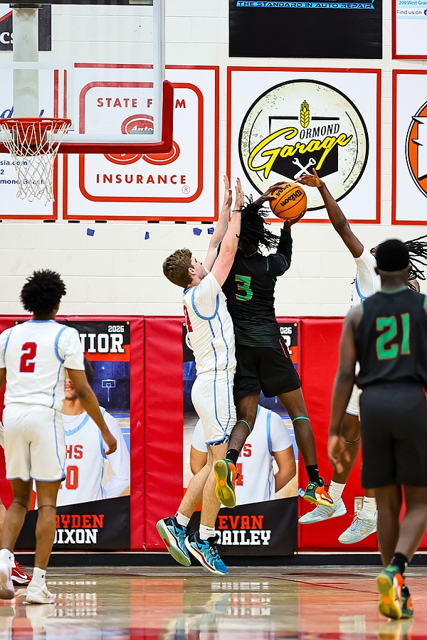 Seabreeze's Jeremiah Outler (0) goes up for a shot against Jones' Mike Michel. Photo by Keishia McLendon