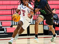 Seabreeze's Willie Tucker Jr. (5) drives baseline. Photo by Keishia McLendon