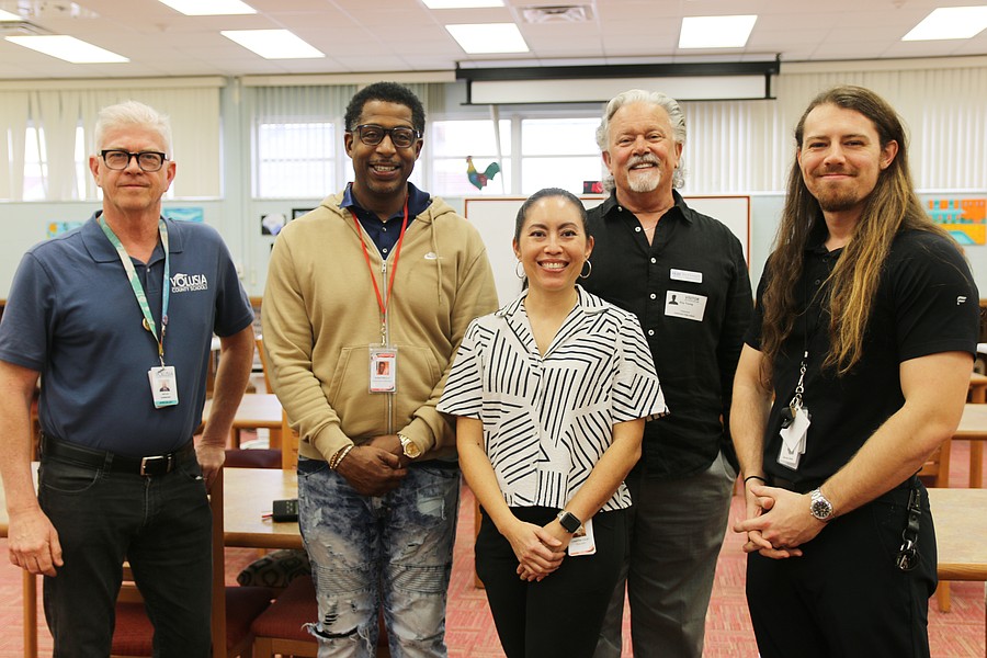 Volusia County Schools Visual Arts Specialist Bryce Hammond, Assistant Principal Dhand Presley, Seabreeze art teacher Christine Colby, HUM Executive Director Roy Young, and Seabreeze teacher Jett Wolfe. Photo by Jarleene Almenas