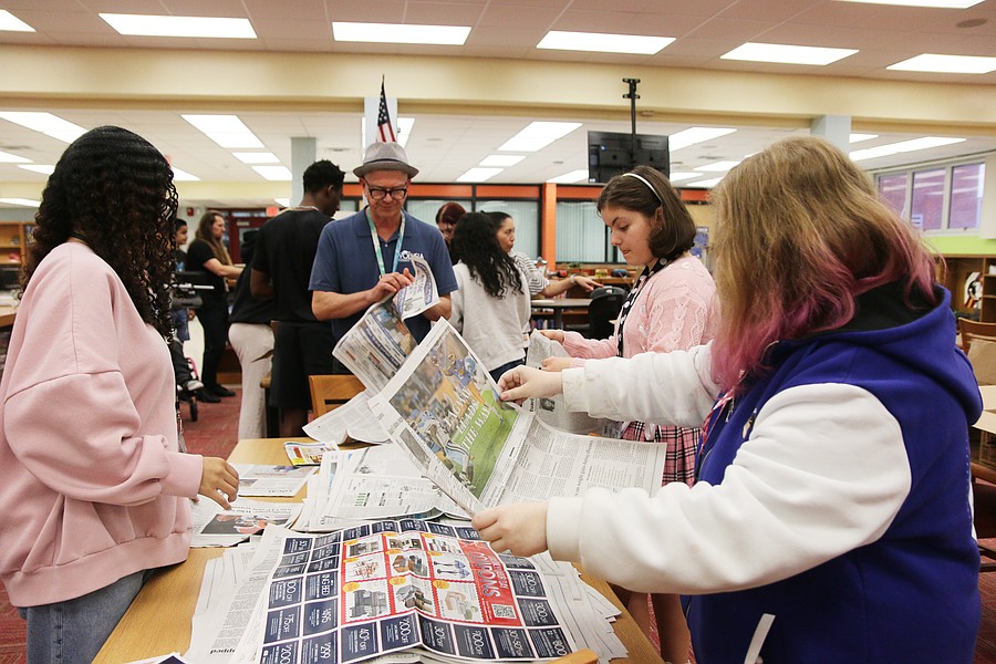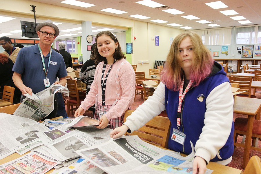 Seabreeze teacher Jett Wolfe helps a student pack up bowls at the media center on Thursday, Feb. 12. Photo by Jarleene Almenas