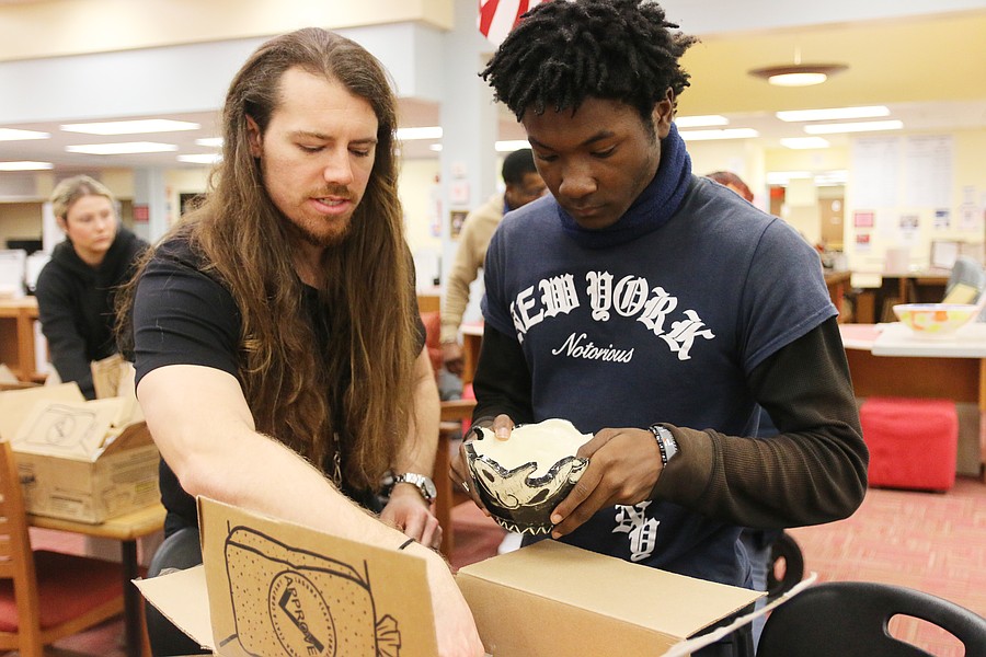 Volusia County Schools Visual Arts Specialist Bryce Hammond helps students pack bowls on Thursday, Feb. 12. Photo by Jarleene Almenas
